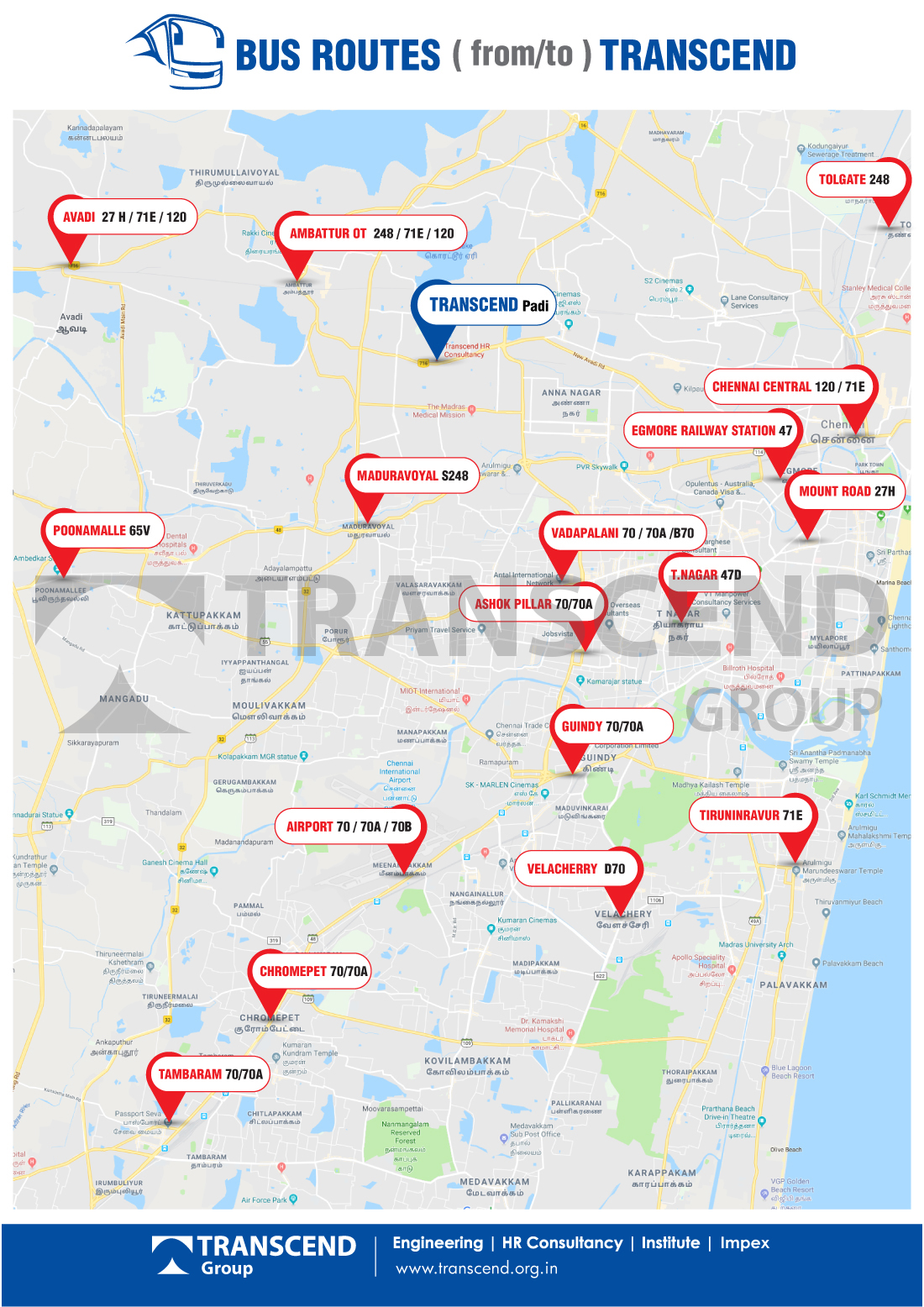 Contact Us HEAD OFFICE: Transcend Institute – 783, M.T.H. Road,Opp. Britannia Company,Padi, Chennai – 600 050. Phone : +91 44 26244441, 42017068 Contact Person: A.BasheerPhone: +91 8015451040E-mail: transcend111@yahoo.co.in Accessibility Bus Routes from/to Transcend Institute FORM Are you ready to take the next step toward your future career? Application Form